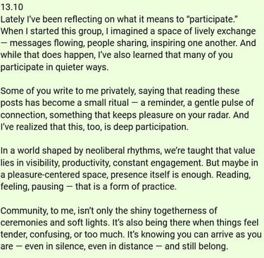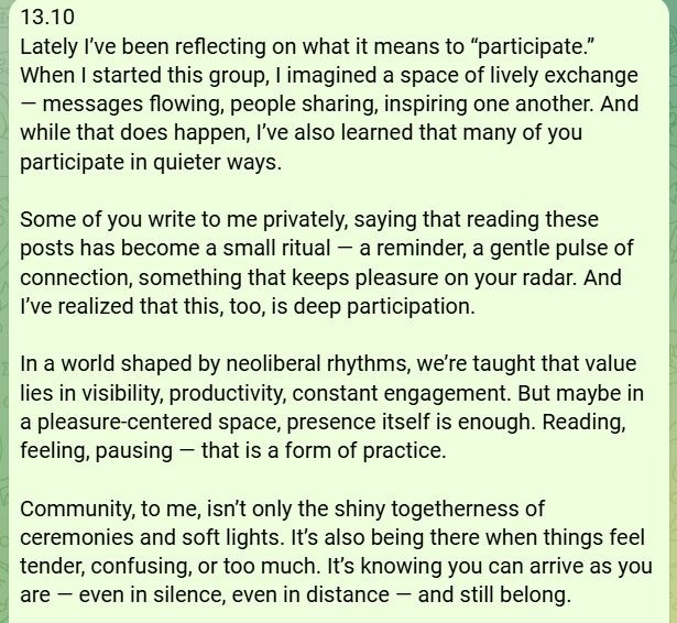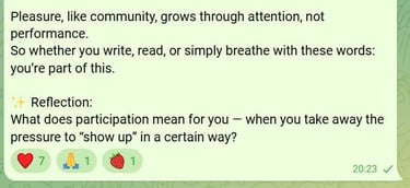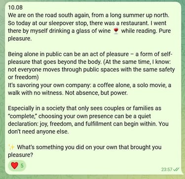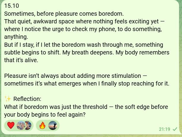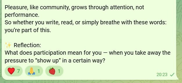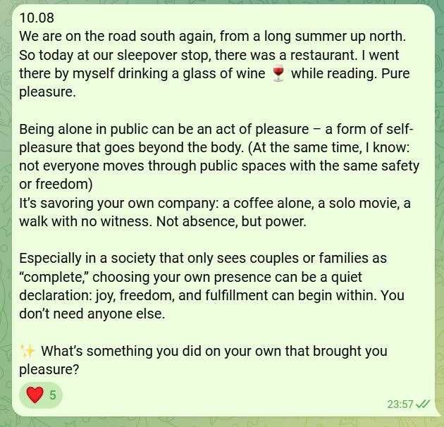 Wie immer: Danke für Deine Gedanken und Fragen. Ich nehme die Inspiration mit in meine Tage und denke für mich weiter oder erinnere mich an Situationen, die mir begegnet sind. Ich freue mich darauf, wenn ich beginne, stärker eigene Impulse zu entwickeln. Noch bin ich irgendwie in einer Beobachtungsphase. Und Deine Texte als Begleitung zu haben, ist für mich unglaublich wertvoll und wichtig. Ich fühle mich verbunden. Das macht einen großen Unterschied für mich.